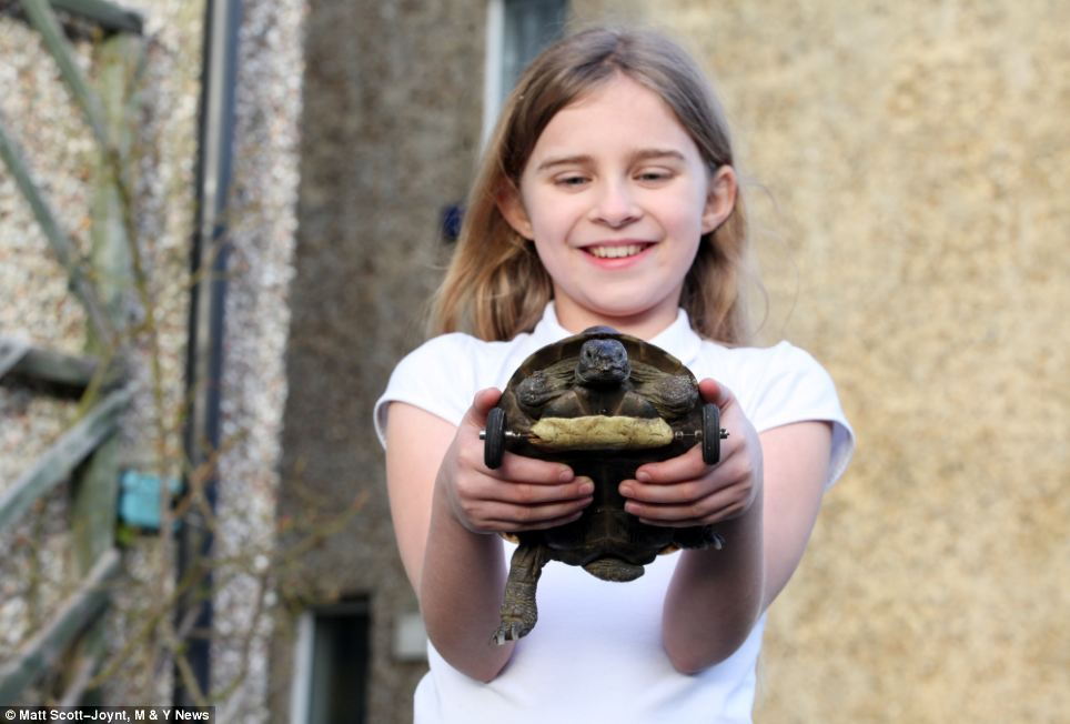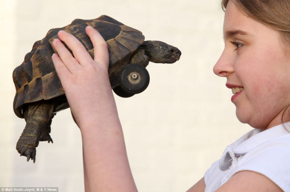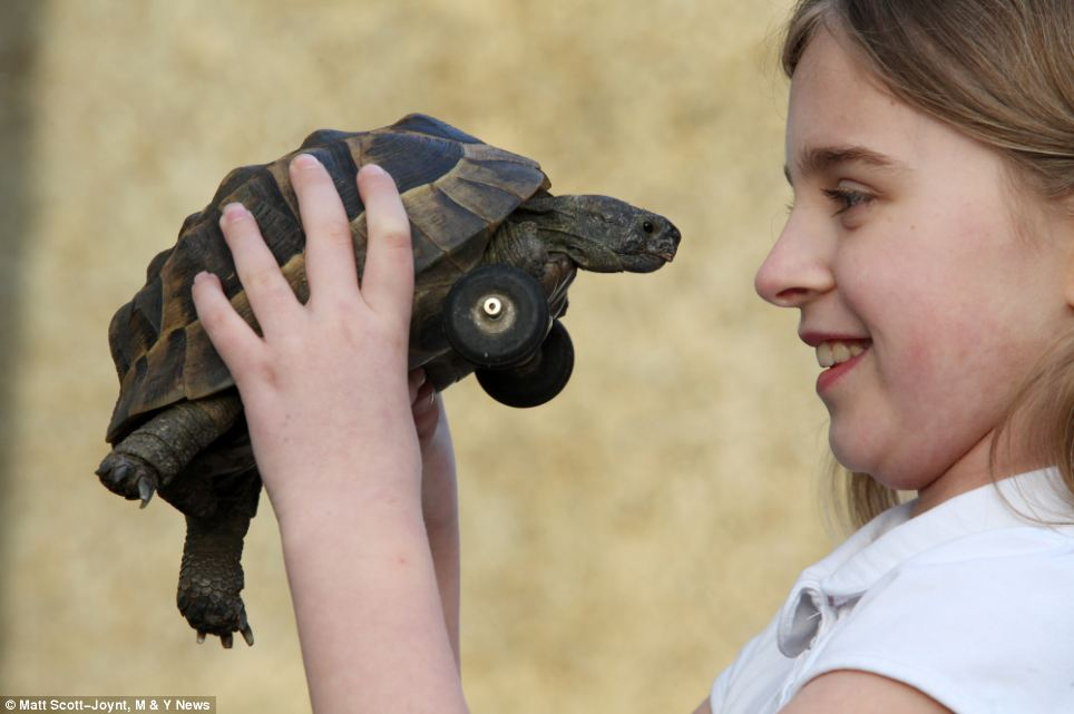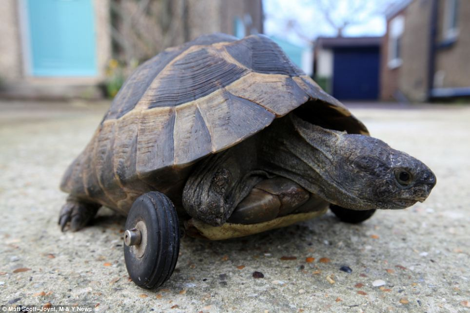 The small wheels were carefully affixed to Septimus’s yellow and brown shell using a special putty, and he adapted swiftly to his new mode of mobility.