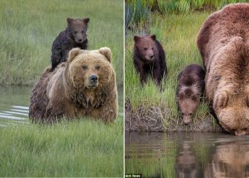 Read moreDetailsIn a heartwarming series of photos, a young brown bear clings to its mother’s back as they cross a river...